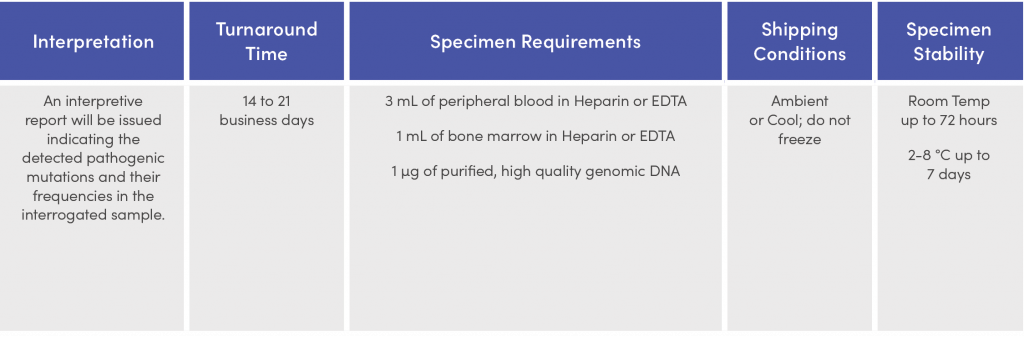 MyMRD® is a hotspot panel that detects all classes of variants identified in a precisely defined set of targets that commonly drive myeloid malignancies including acute myeloid leukemia (AML), myeloproliferative neoplasms (MPN) and myelodysplastic syndrome (MDS).  Deep sequencing provides unparalleled precision and detection of low-level mutations in patients, enabling clinicians to study important aberrations implicated in the causation, prognosis, and recurrence of myeloid disorders.